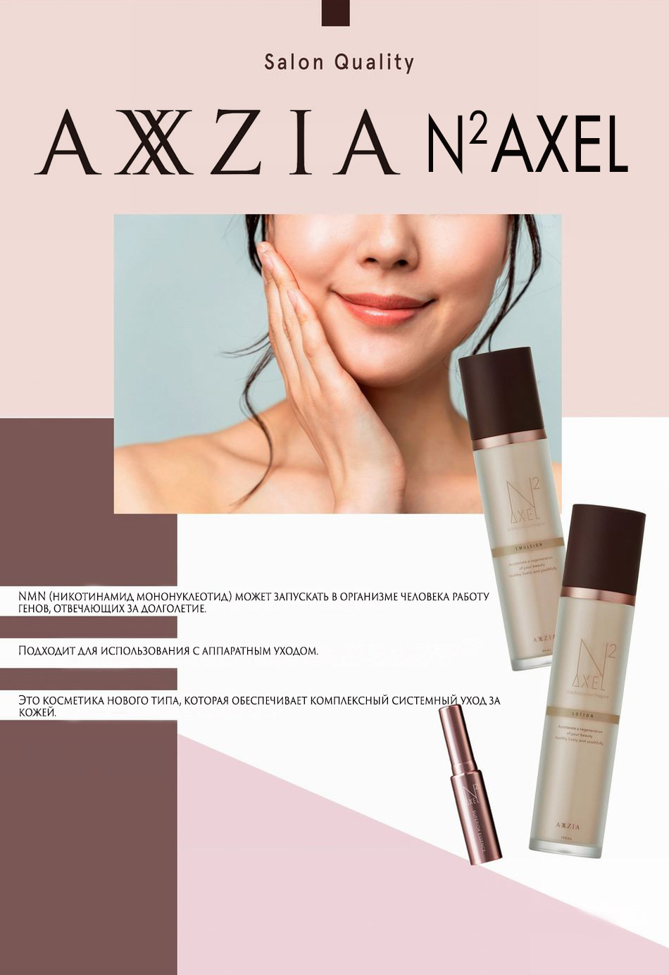 Исследования этого вещества активно идут в последние годы, и эксперименты показали, что при наружном применении NMN активизирует регенерацию и омоложение клеток в роговом слое. В сочетании с 6 пептидами и гиалуроновой кислотой в линии AXXZIA N2Axel эта формула делает кожу более плотной, глянцевой, уменьшает сетку морщин и дает отсрочку процессу старения.